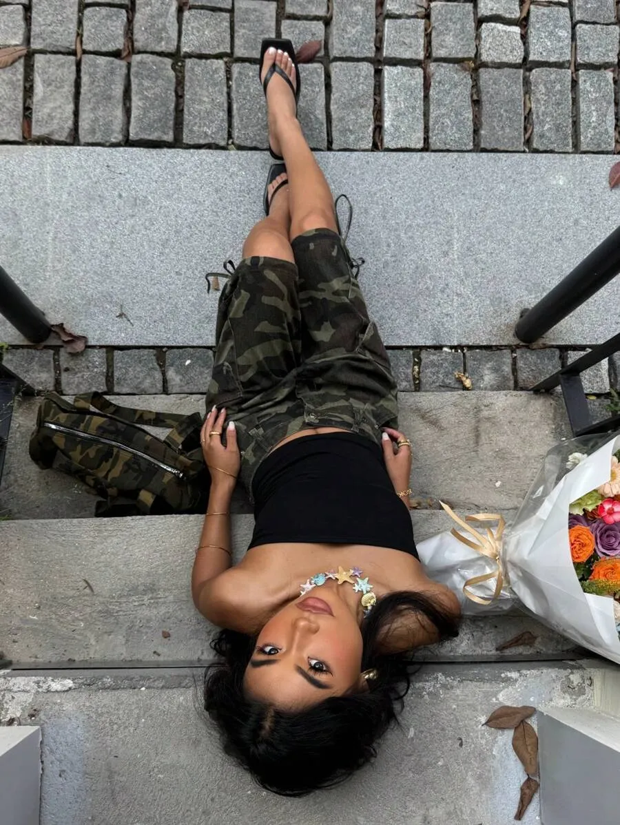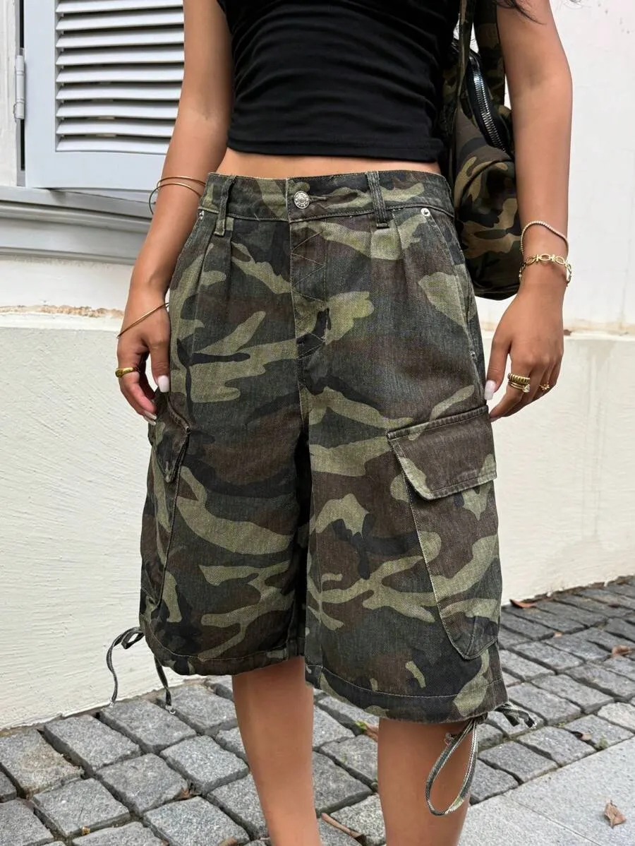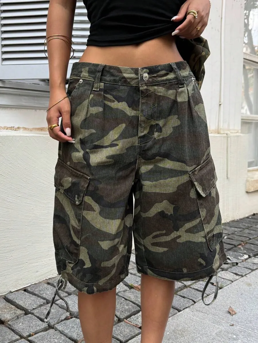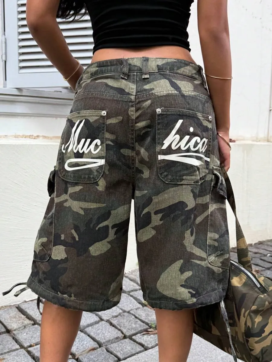 Camouflage Print Casual Loose Fit Pocket Denim Shorts