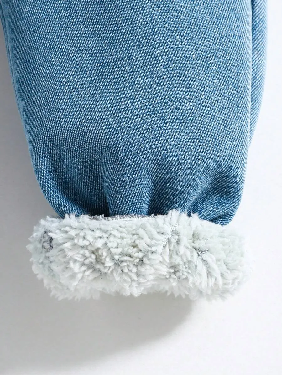 Fluffy Collar Drop Shoulder Denim Effect Thermal Lined Jacket