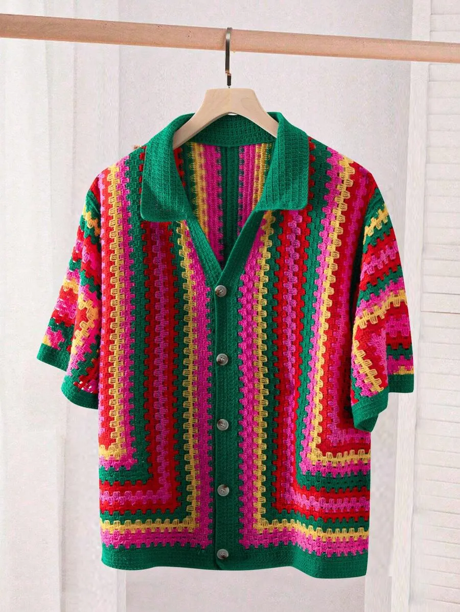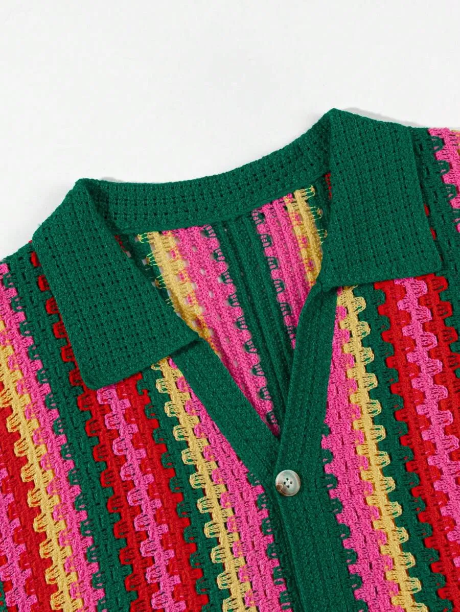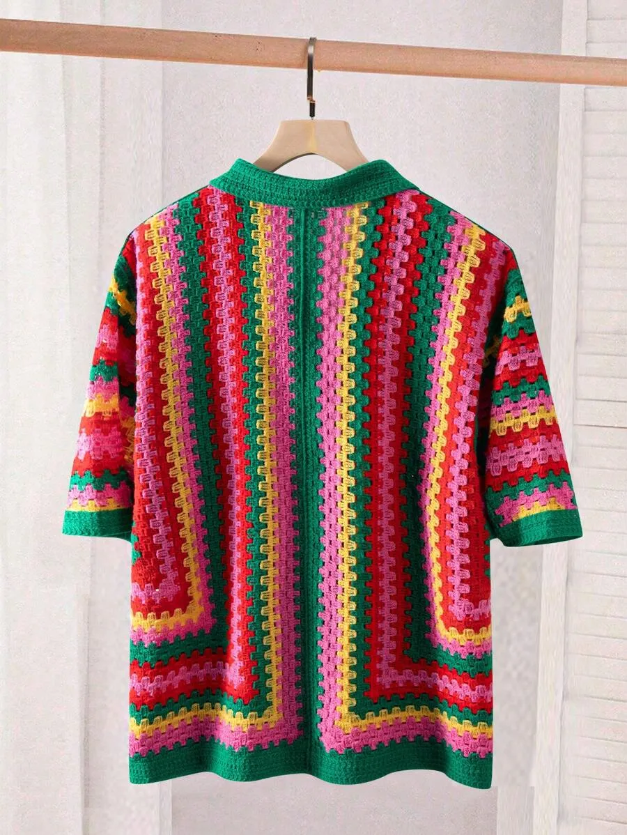 Striped Crew Neck Short Sleeve Knit Top And Knitted Shorts