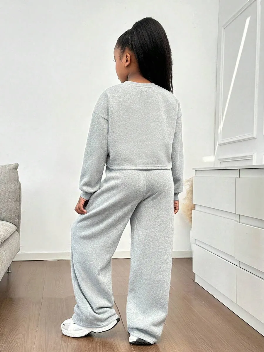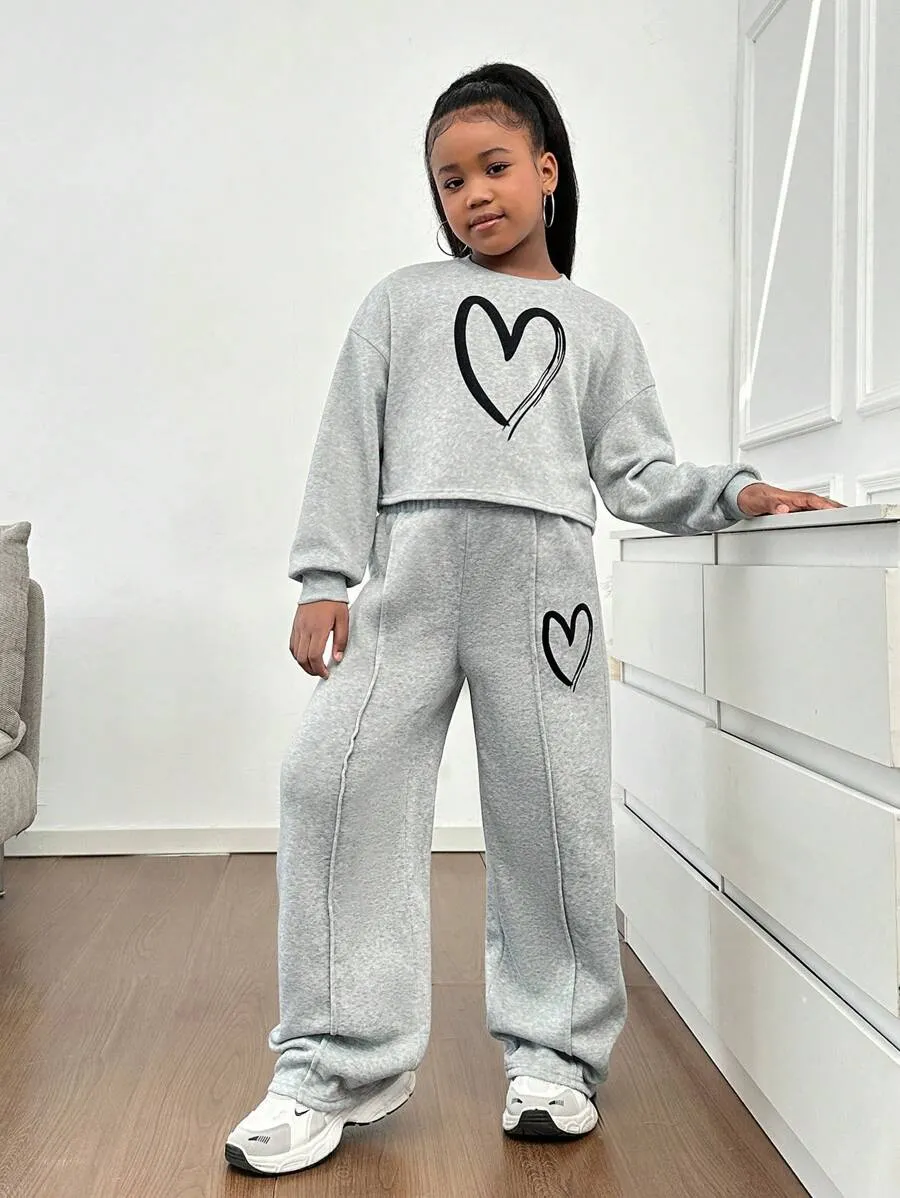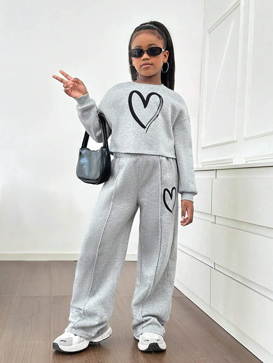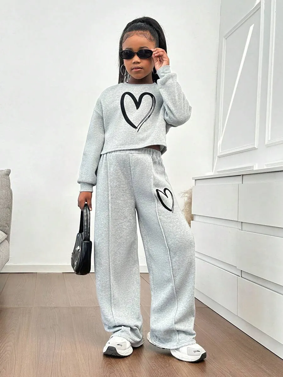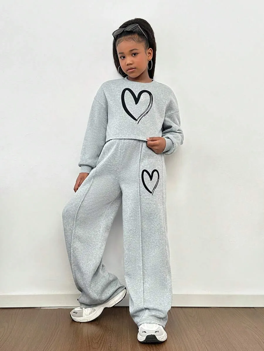 Heart Print Pullover Sweatshirt & Pleated Sweatpants