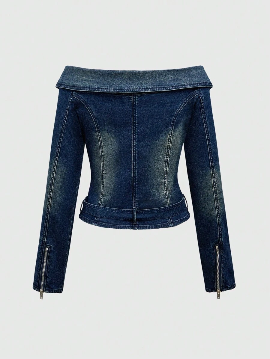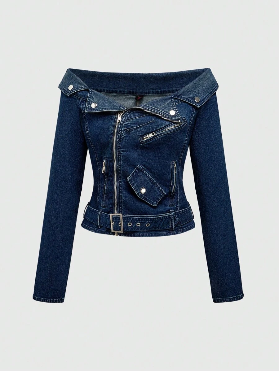 Off Shoulder Form Fitting Cropped Denim Moto Jacket