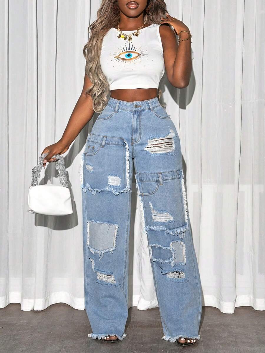 Ripped Pocket Simple Casual Denim Jeans