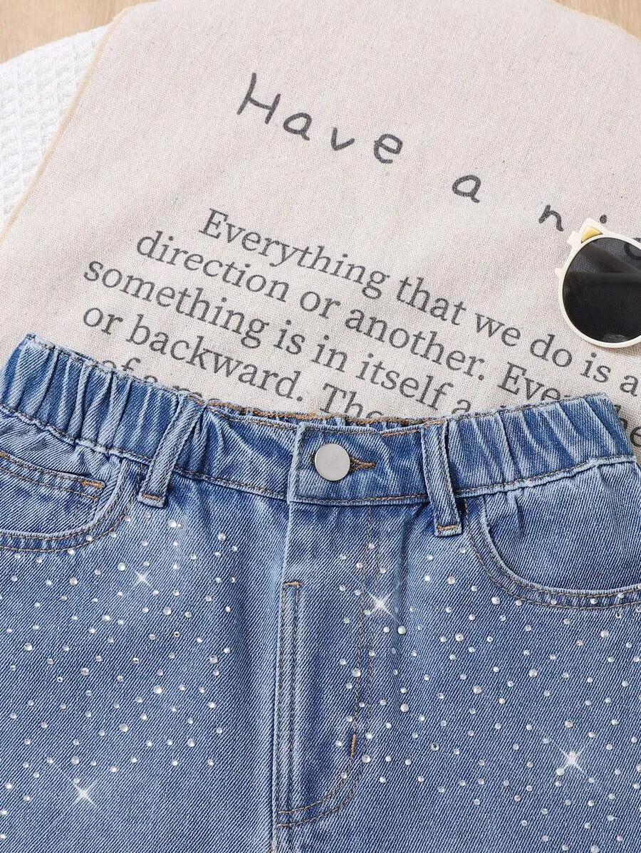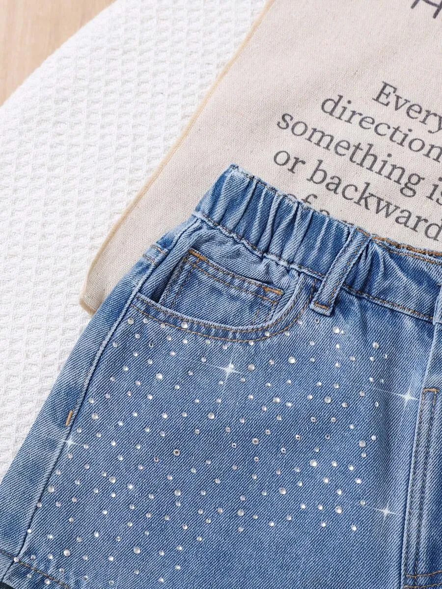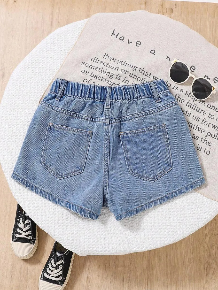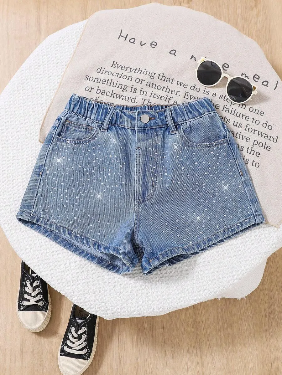 Ripped & Rhinestone Detail Pocket Denim Wash Casual Shorts