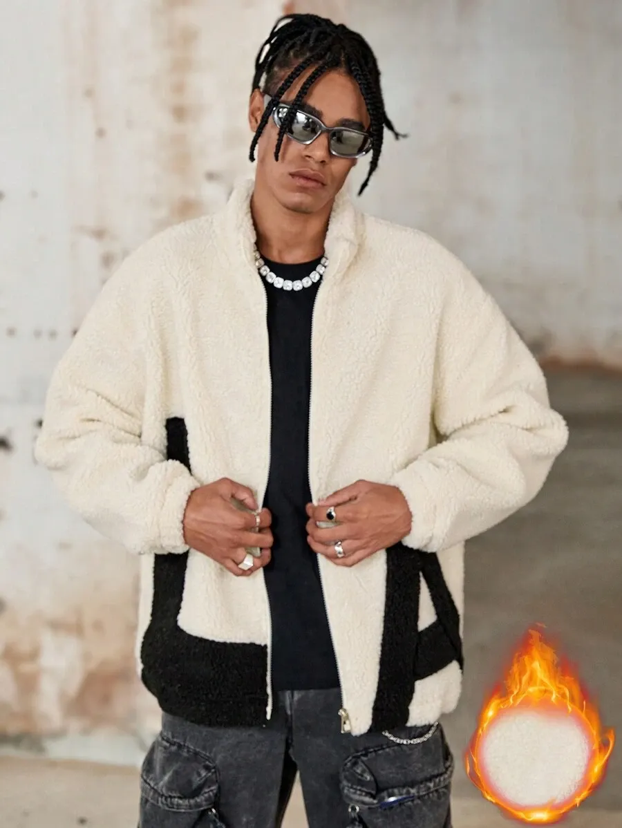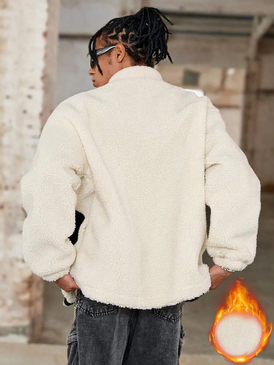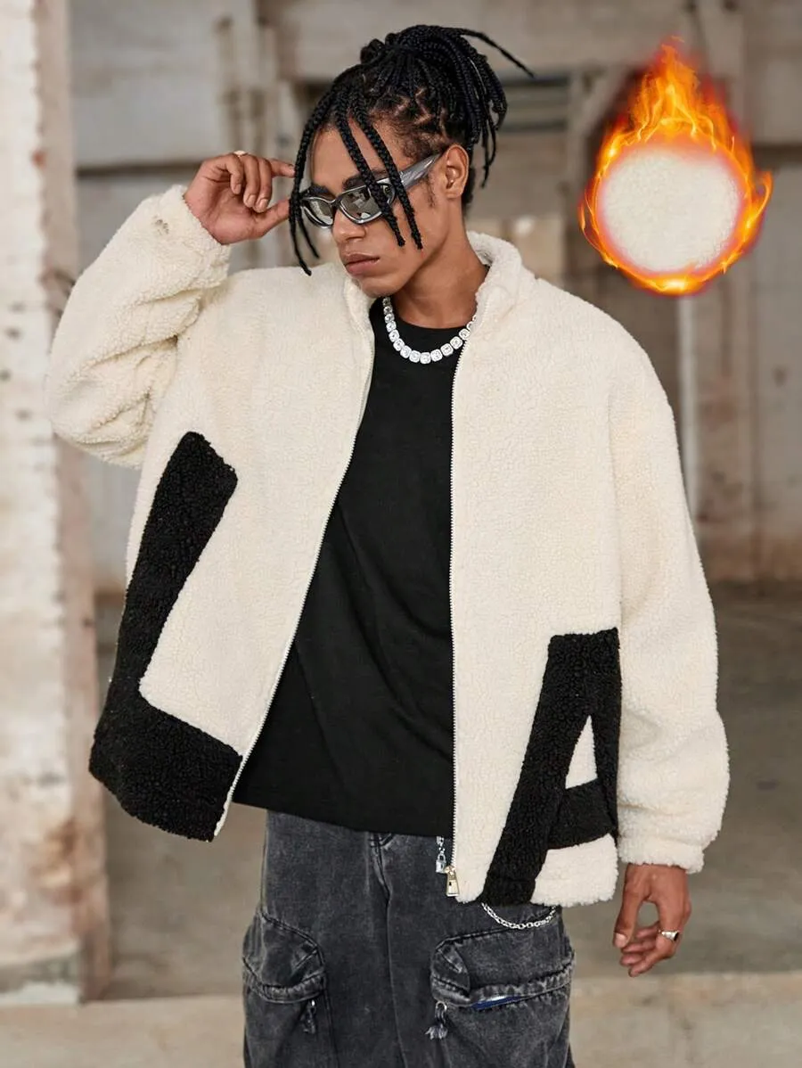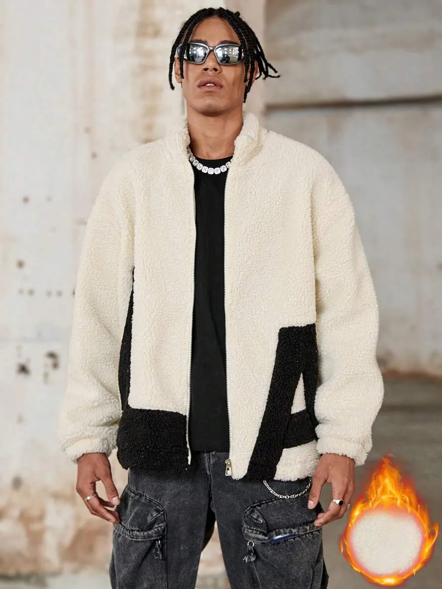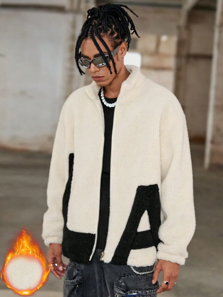 Solid Color Splice Front Zipper Long Sleeve Letter Graphic