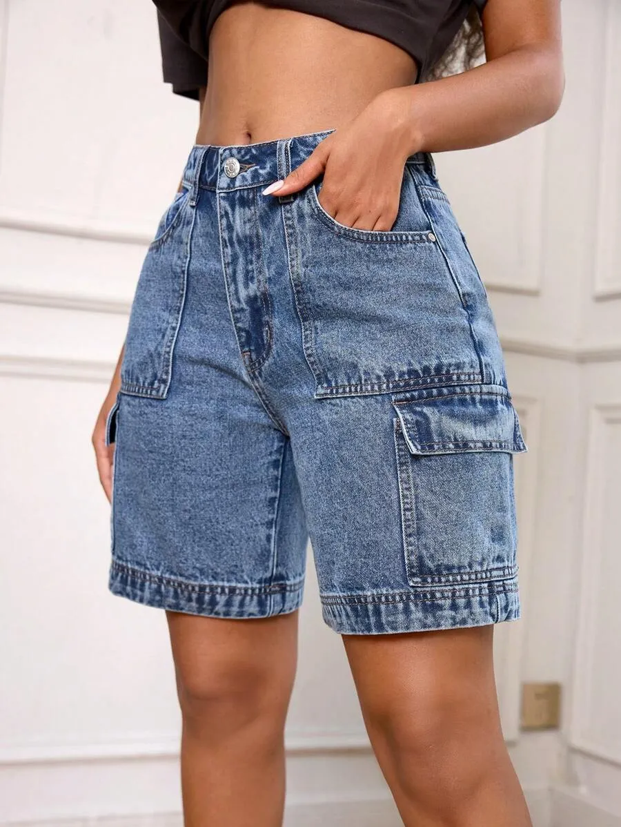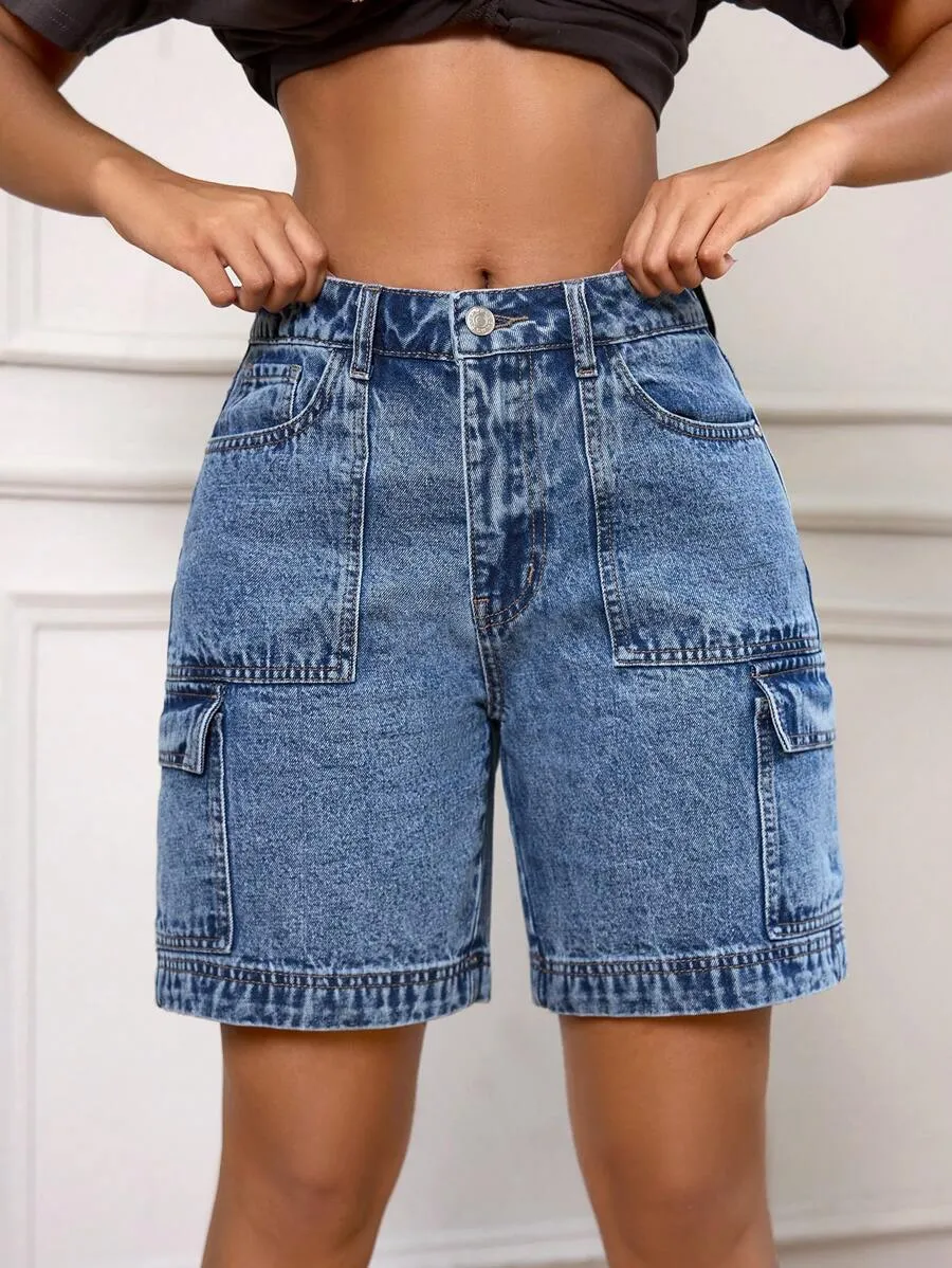 Khaki Denim Elastic Drawstring Waist Flap Pocket